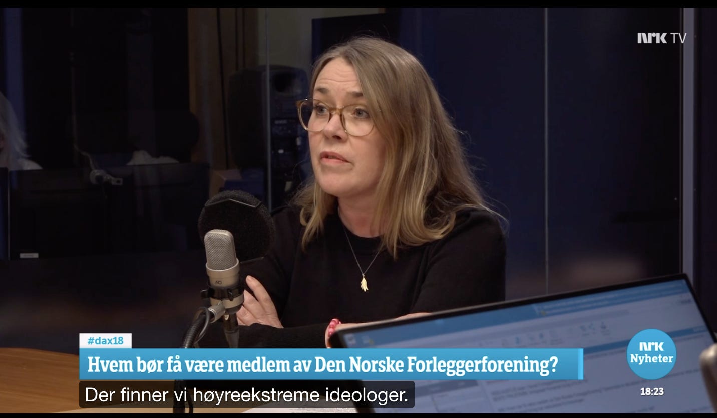 Utgangspunktet for debatten var at Humanist forlag, representert av Bente Pihlstrøm, mener vi bør ekskluderes fra Forleggerforeningen fordi vi angivelig er «fascister» som er «klart anti-demokratiske» og utgir bøker skrevet av «høyreekstreme ideologer». Pihlstrøm ville neppe reagert om Aschehoug eller Gyldendal hadde gitt ut Mein Kampf, og hun tar ikke til orde for å ekskludere forlag drevet av kommunister som utgir bøker av Marx eller Lenin. Men når folk hun definerer som «fascister» utgir politisk filosofi hun definerer som «reinspikka fascisme», stiller det seg annerledes. Pihlstrøm vil begrense andre forlags organisasjons- og ytringsfrihet på grunnlag av meninger hun tillegger de til de som driver forlaget.